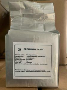 – Enzyme TG (Transglutaminase) là chất phụ gia chống hỏng mọc, chống mất liên kết khi xay. Tỷ lệ dùng chỉ 2 gram cho mẻ xay 1kg sản phẩm, được dùng trực tiếp xay cùng thịt.