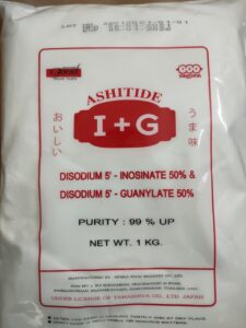 – I+G là chất điều vị và còn được gọi là bột siêu ngọt. Chất siêu ngọt I+G dùng với tỷ lệ rất nhỏ, chỉ bằng một phần năm hoặc một phần bẩy so với mì chính (Bột ngọt). Được dùng với mục đích làm tăng độ đậm đà tăng vị ngọt thịt cho sản phẩm.